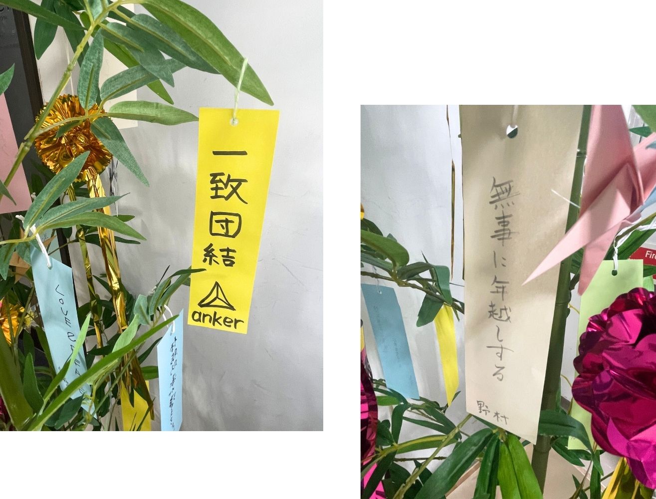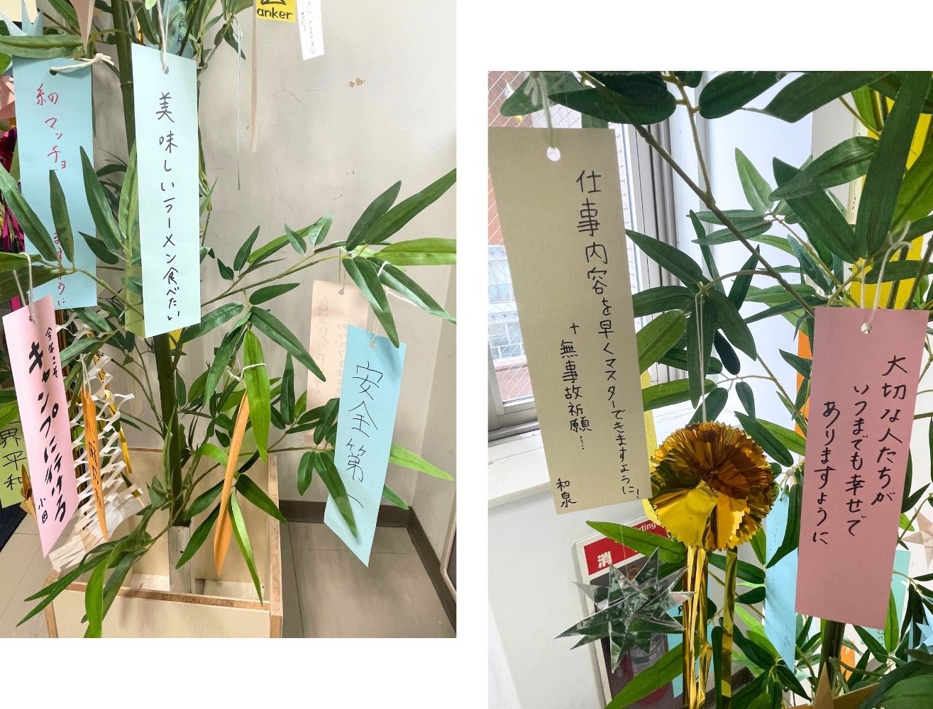笹には社員の願いごとを書いた短冊も飾っています。